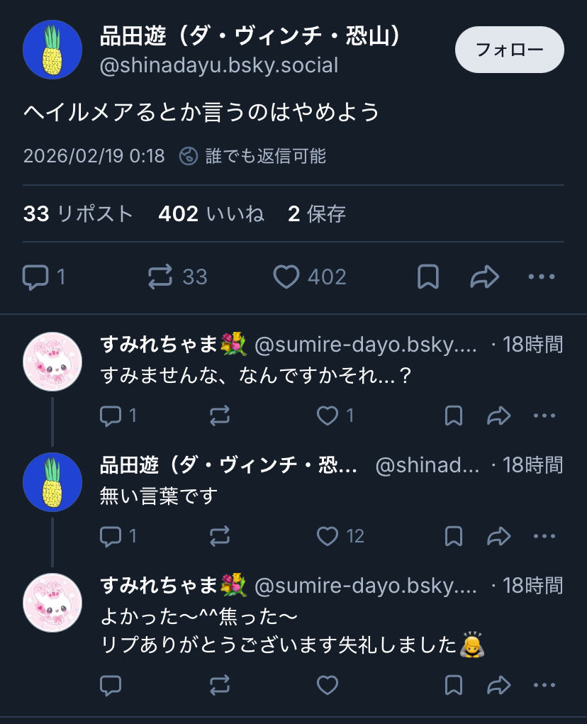 | … | 5026/02/19(木)19:12:51No.1403543610そうだねx1#ヘイルメアると言うのやめよう |