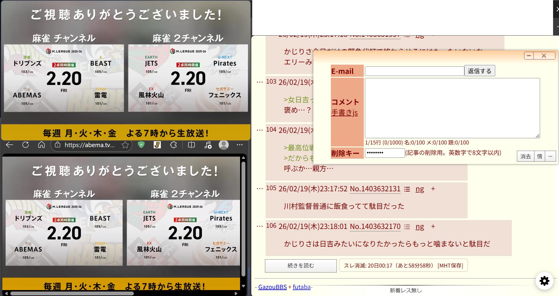 | … | 4026/02/19(木)23:03:08No.1403627120そうだねx2>>>明日はABEMASと雷電とドリブンズだから大変だぞ |