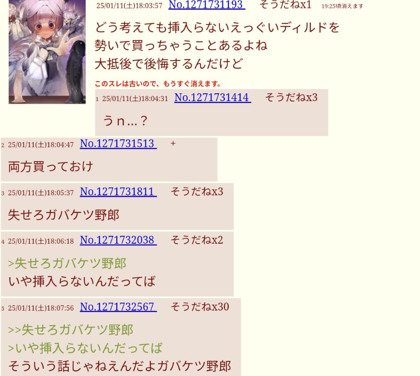 | … | 526/02/19(木)22:23:11No.1403612771+昔そんなにアナニー流行ってたのん…? |