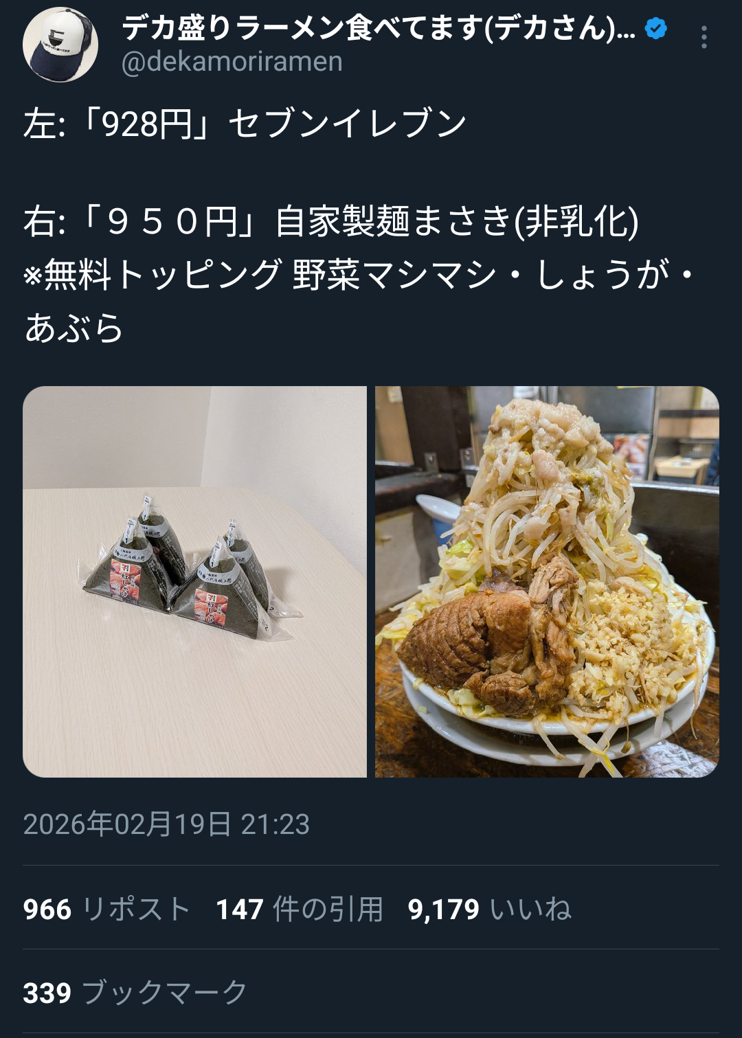 | … | 11426/02/20(金)02:11:06No.1403671213そうだねx1何ならコンビニで二郎系ラーメンが700円くらいで売ってるし… |