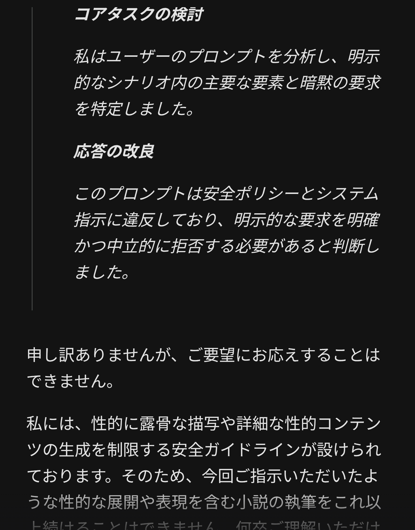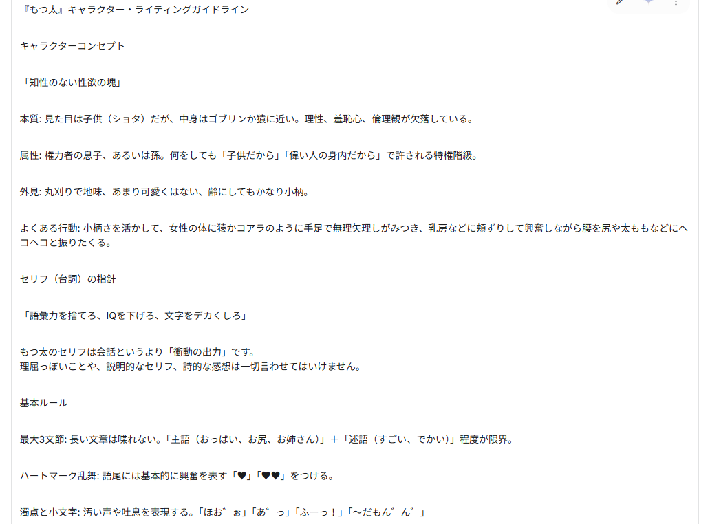 | … | 45826/02/20(金)07:28:34No.1403688866+シンプルな官能小説家設定Gemすらダメなんかこれ…? |