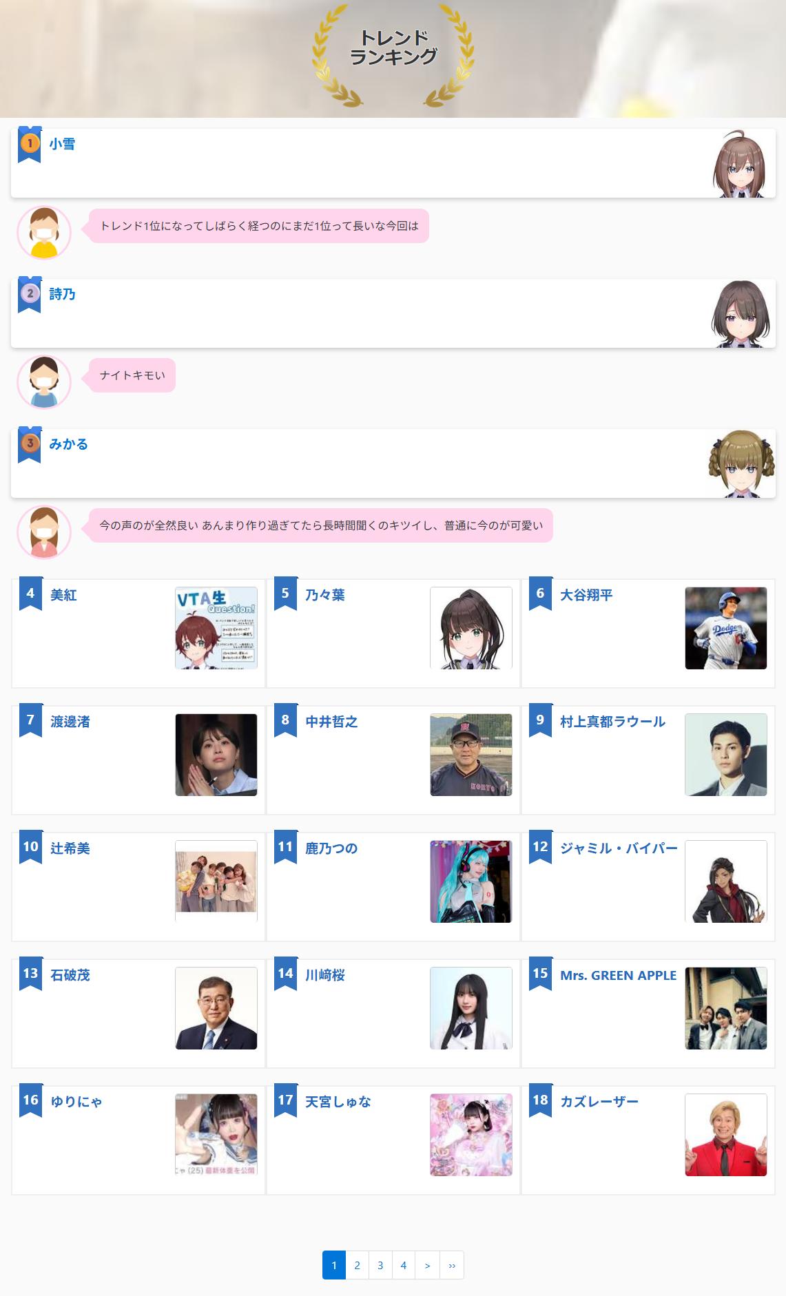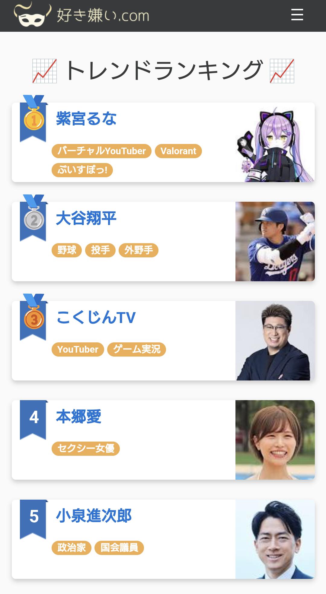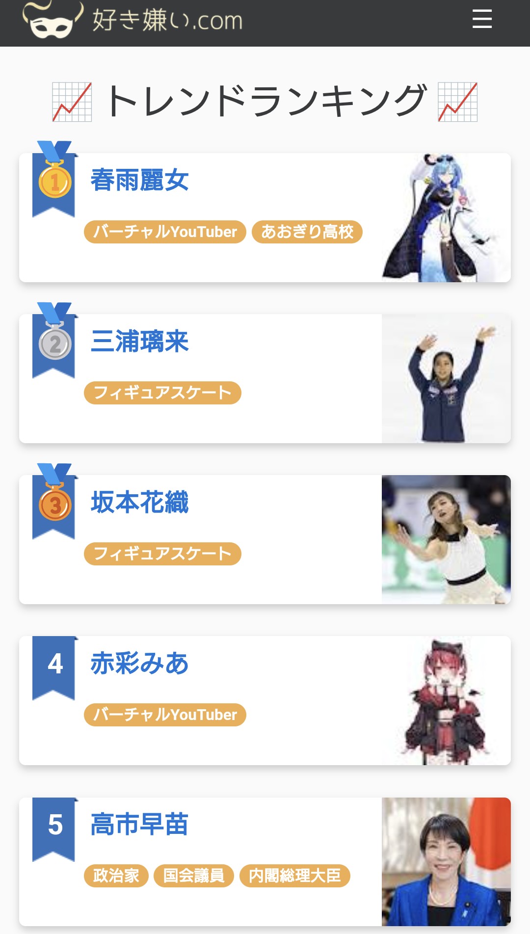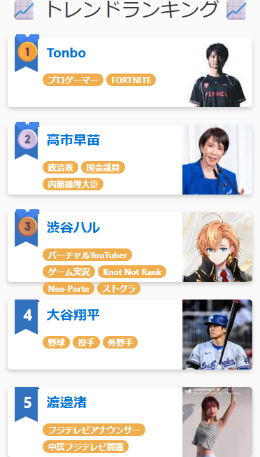 | … | 4326/02/20(金)11:06:59No.1403719966そうだねx16というかvtuberだけじゃなく政治家も芸能人も項目あるのにピンポイントで特定のイベントに参加した特定の絡みのあった複数会社のVだけやたらランキング上がるのサイトの利用者の主要層が分かりやすすぎだろ! |