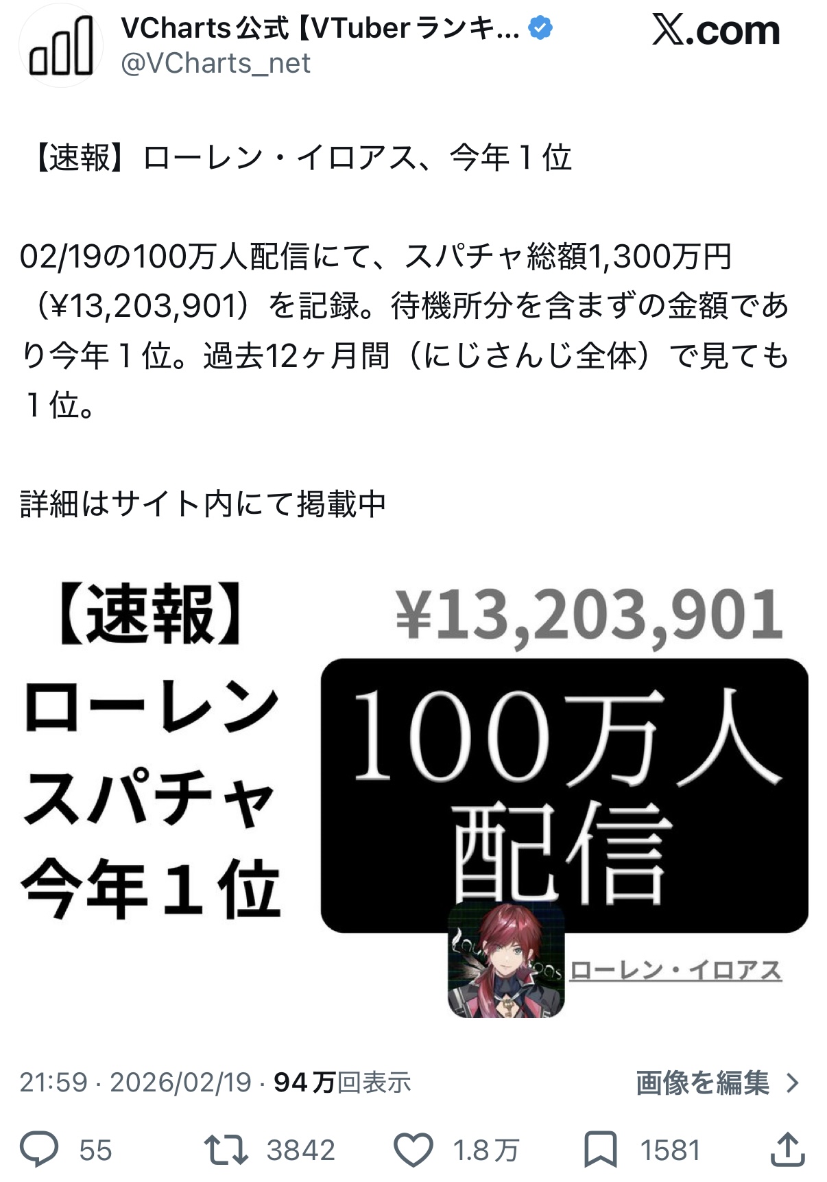 | … | 1726/02/20(金)14:49:14No.1403768276そうだねx24>>2月19日はにじさんじのローレンさんがチャンネル登録者数100万人を突破した記念日です |