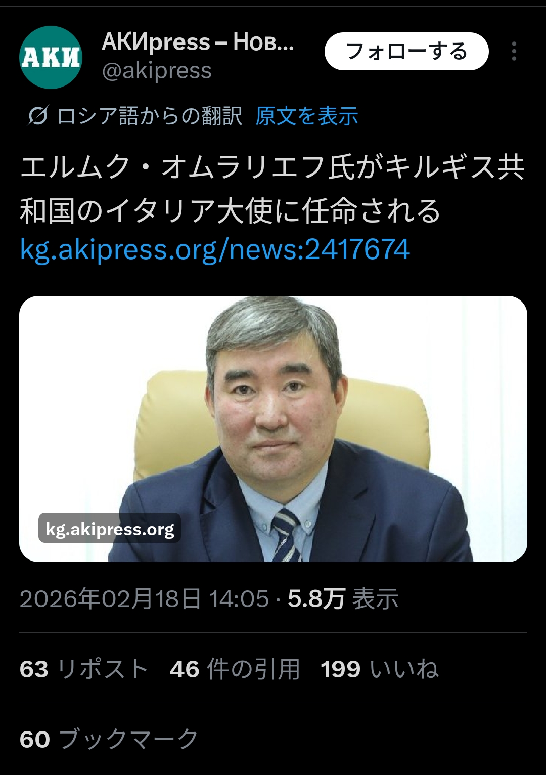 駐イタリア大使に任命されたキルギス共和国のエルムク・オムラリエフ氏