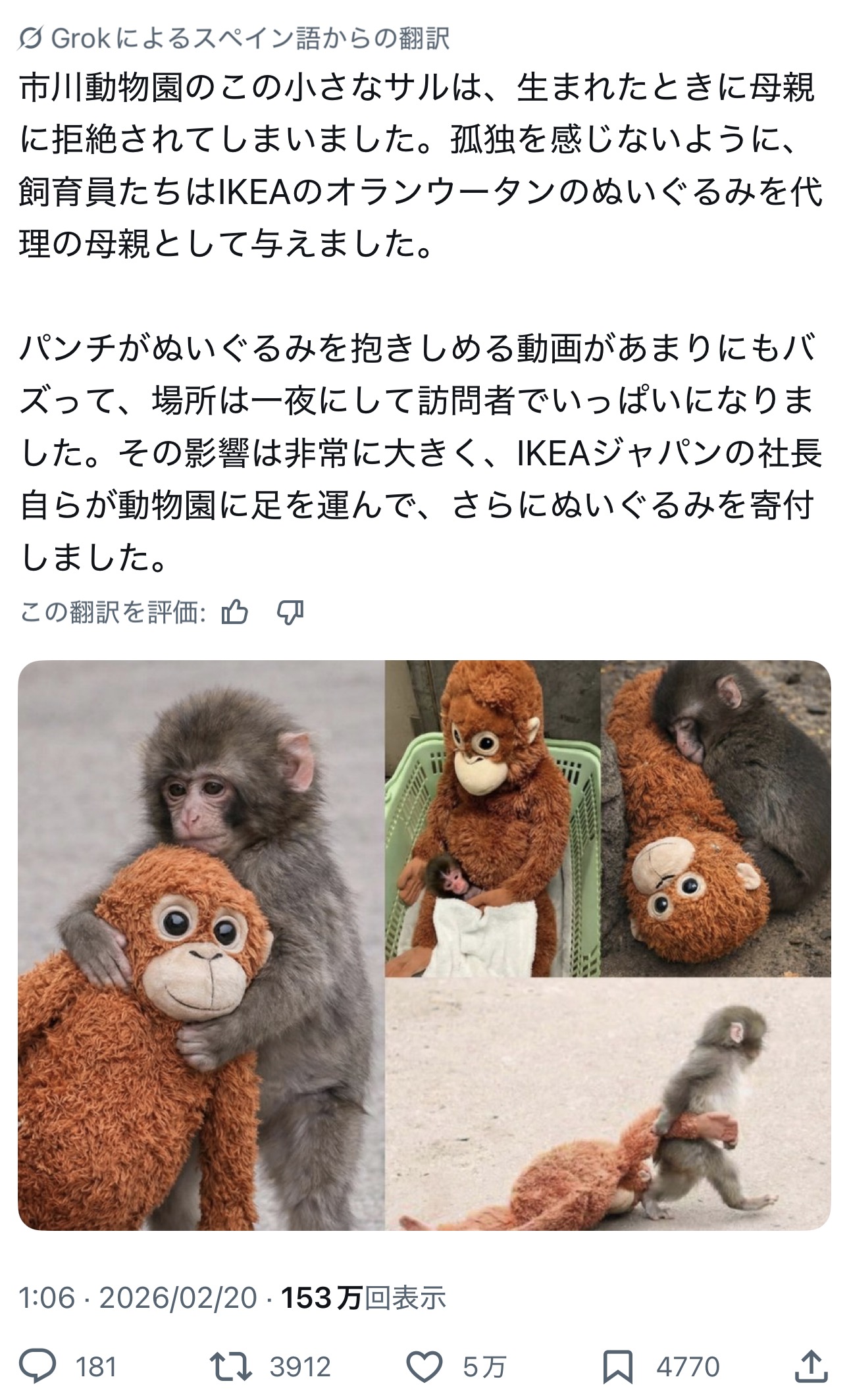 | … | 13226/02/20(金)20:01:33No.1403849106+>>この動物園は育児放棄された子猿をちゃんと群れの一員にさせた実績あるから大丈夫でしょう |