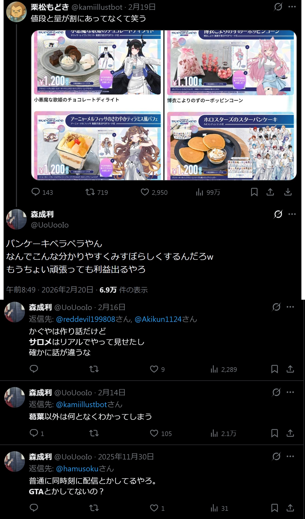| … | 1326/02/21(土)00:08:42No.1403949609+>フードに限らずグッズやライブのクオリティや2D3Dほか諸々で酸っぱい葡萄してると思う |