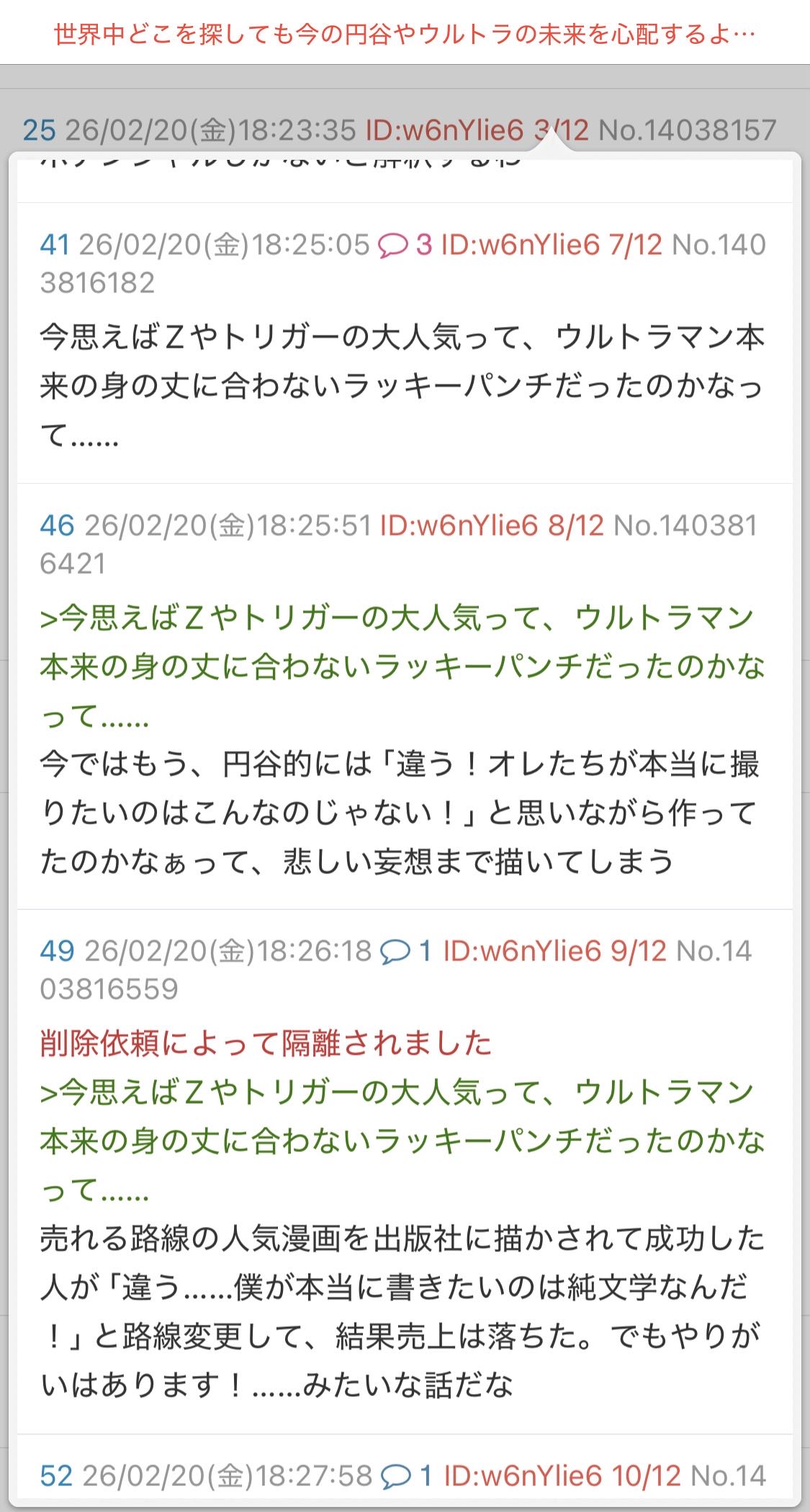 | … | 5126/02/21(土)01:28:50No.1403968843そうだねx4>今思えばZやトリガーの大人気って、ウルトラマン本来の身の丈に合わないラッキーパンチだったのかなって…… |