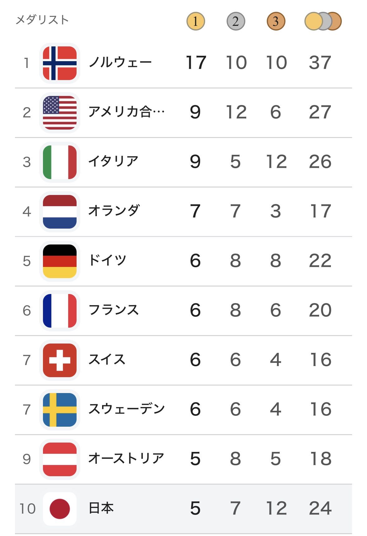 | … | 9726/02/21(土)06:46:34No.1403989900+メダルラッシュとかいうから日本ぶっちぎり一位なのかと思ったらこんなもんなのか |