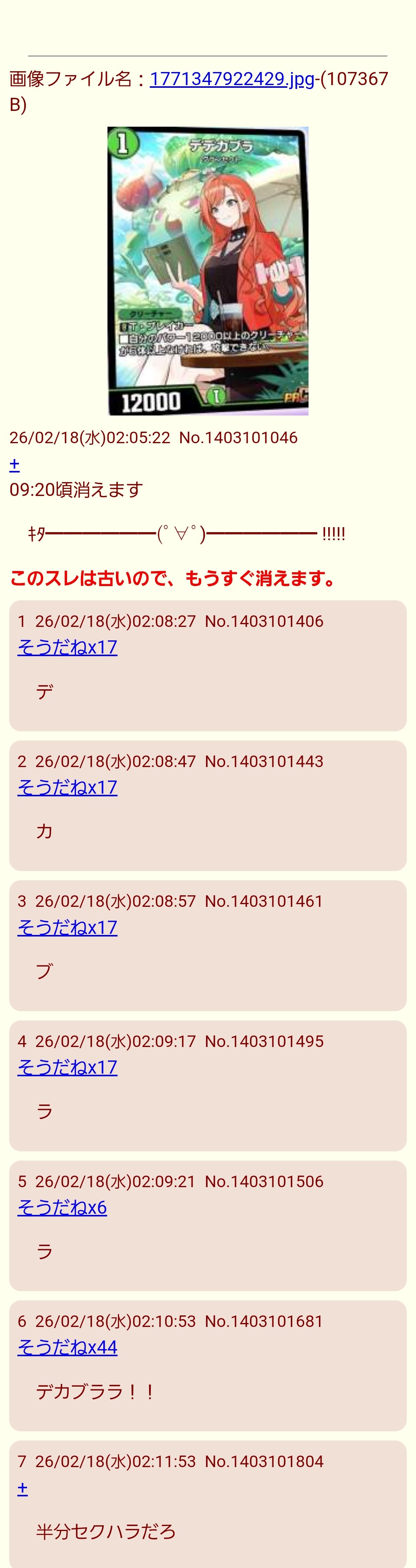 | … | 1526/02/21(土)12:56:34No.1404057372+デカブラを並べられてデッキがキレそうでございます… |