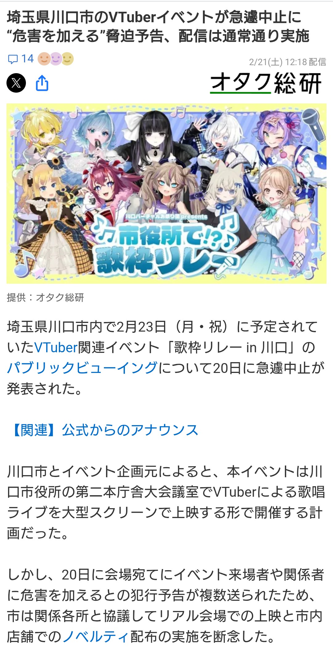 | … | 1326/02/21(土)14:35:56No.1404081782+>X見ると大阪の方でも大きいイベントが同じ理由で中止になってるしアホの行動力が凄すぎる |