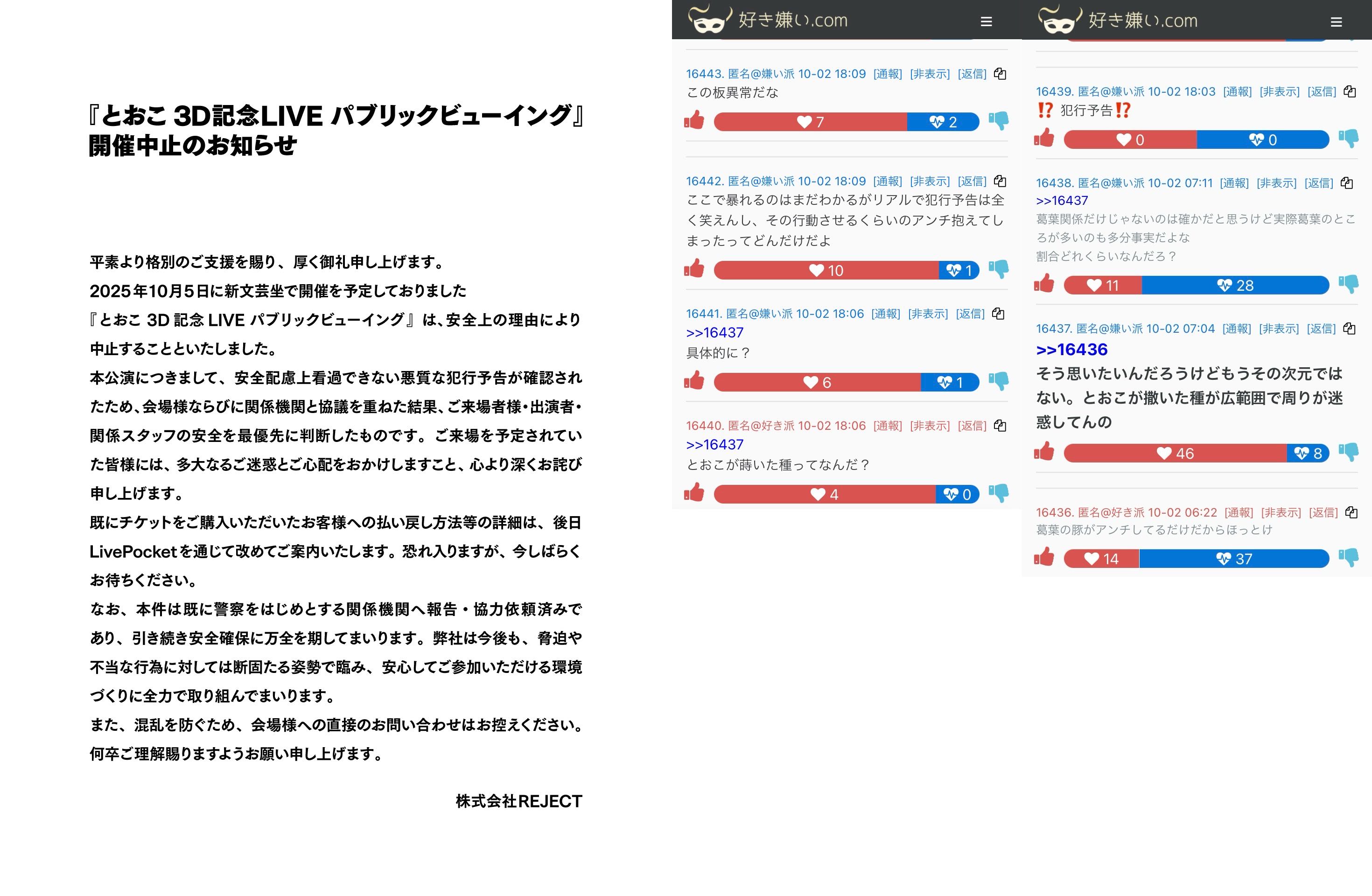 | … | 24726/02/21(土)15:37:50No.1404097275+>今日だけでヒで3件くらい脅迫でのイベント中止みたけど流行ってんの? |
