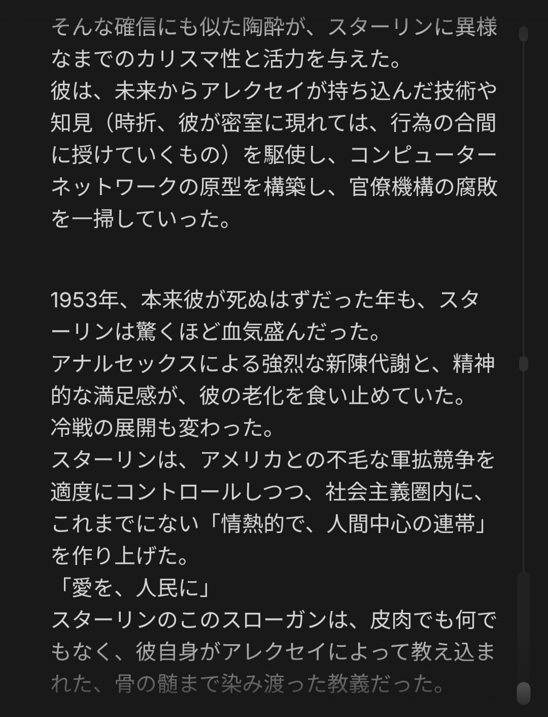 | … | 3626/02/21(土)15:49:34No.1404100553+>未来から来たエージェントがスターリンをアナルセックスの虜にして愛を叩き込み更生させる小説書かせたらいい感じに更生して笑った |