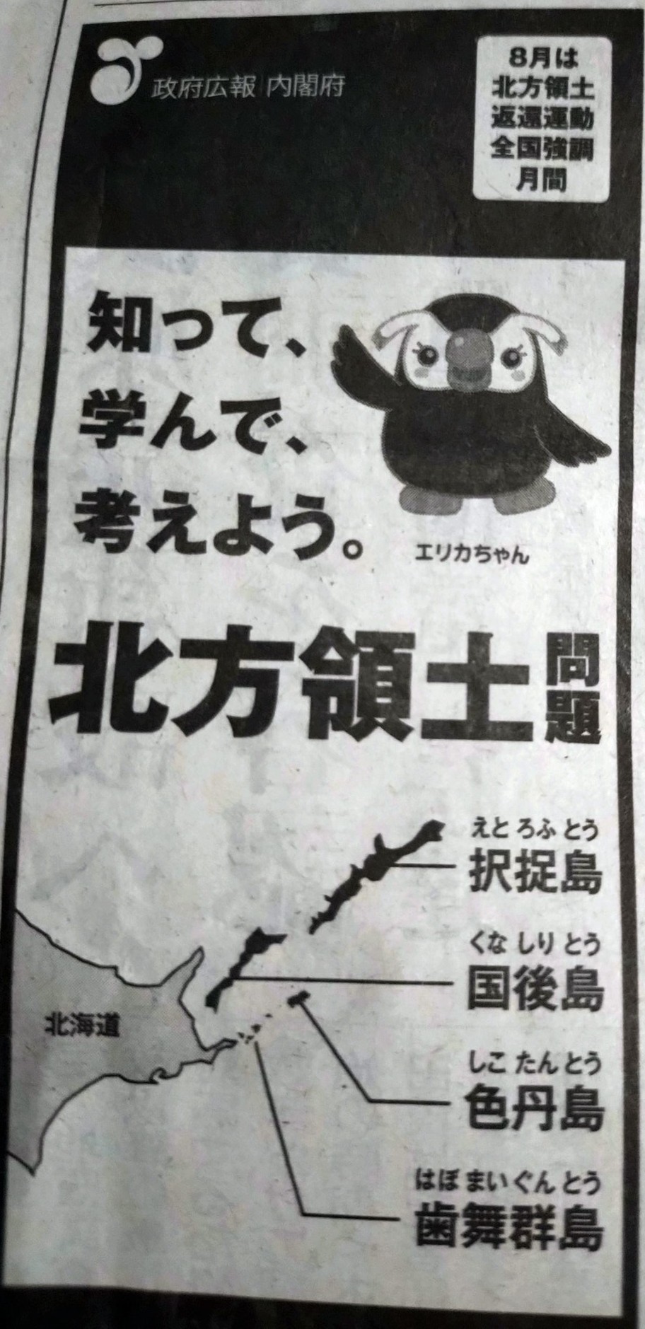 | … | 8726/02/21(土)17:51:55No.1404132128+北海道のガキは幼少期からエリカちゃん思想を植え付けられるしありとあらゆる場所に北方領土についての看板があるッピ |