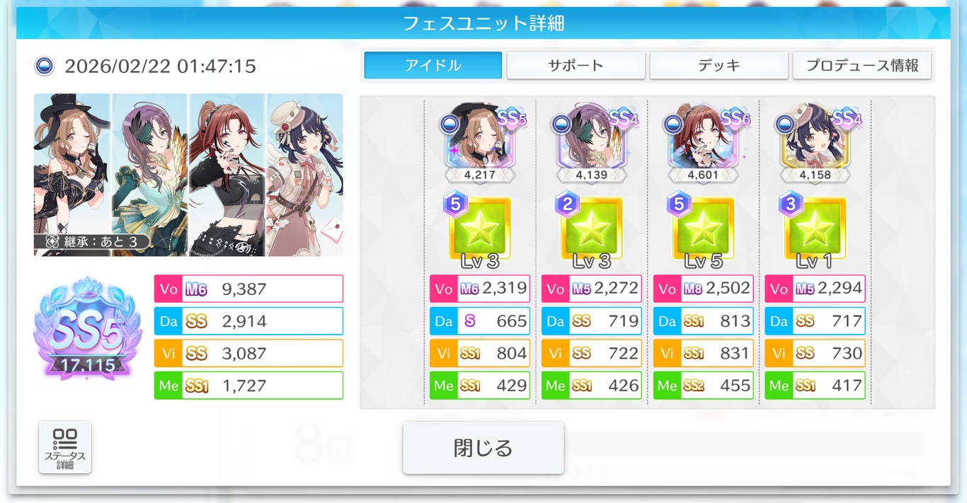 | … | 12926/02/22(日)00:59:53No.1404285776+>自主練でVoステ上げて休憩無し買い物すればいい感じ? |