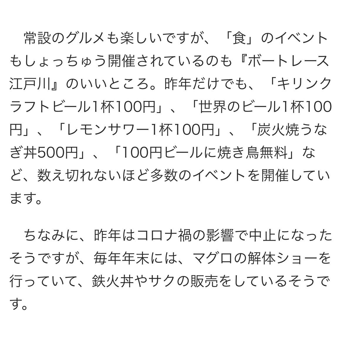 | … | 9326/02/22(日)12:14:55No.1404388709+これボートレース江戸川恒例の行事で開催日はだいたいやってるよ ビール1杯100円の日もある |