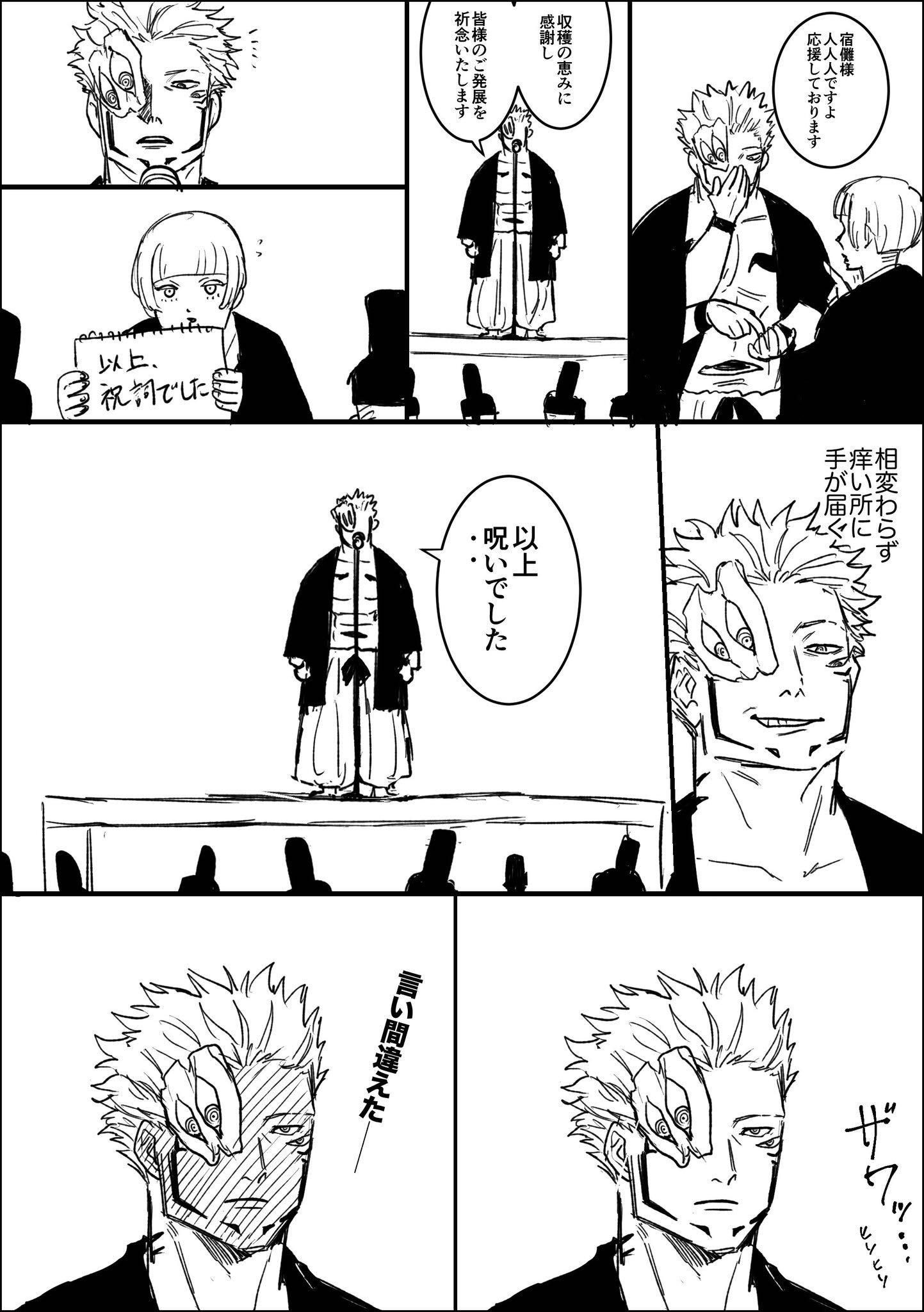 | … | 726/02/22(日)21:35:20No.1404580592そうだねx1宿儺が挨拶程度で緊張とかする? |
