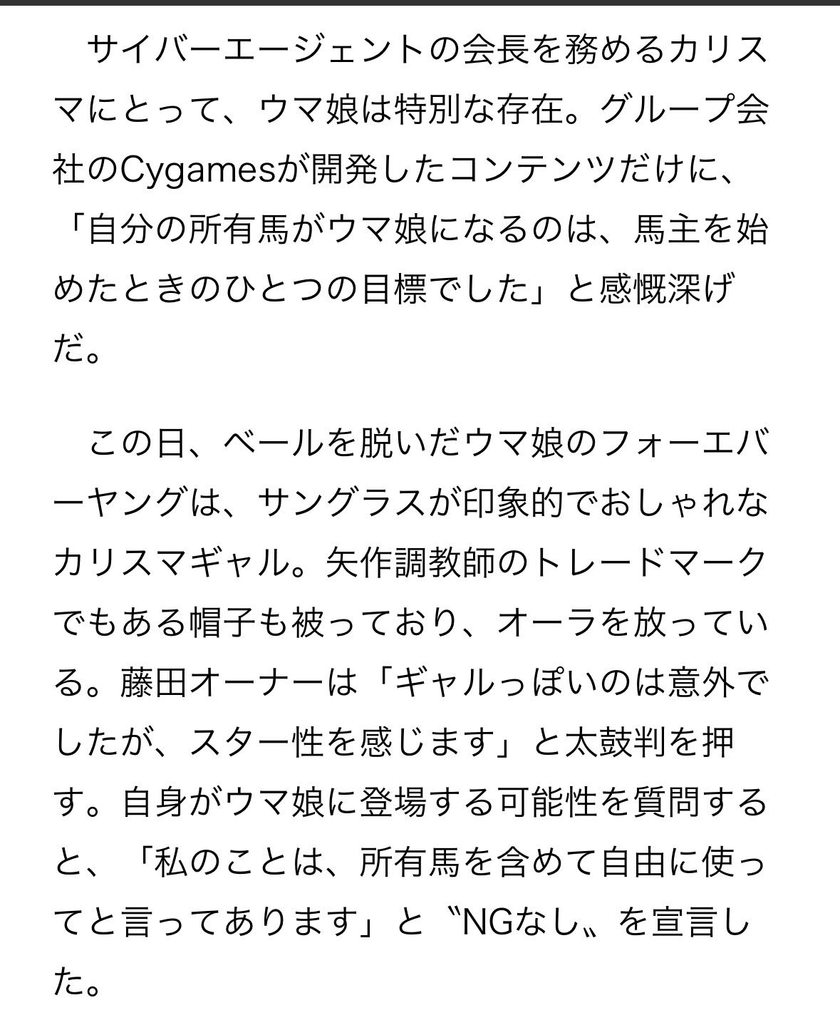 | … | 20626/02/23(月)10:00:19No.1404728341+サンスポのインタビューで藤田オーナーは自分の所有馬のウマ娘化等に関することはNGいっさい無しでなんでもしていいっていってるな |