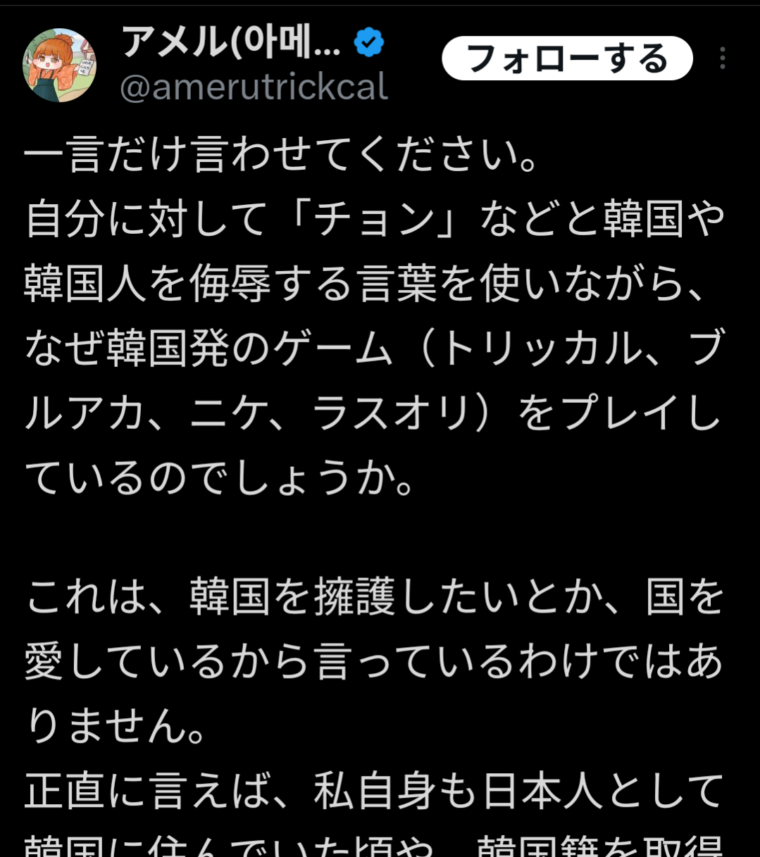 | … | 4726/02/23(月)08:40:13No.1404713295そうだねx1リスペクトしてる韓国ソシャゲやクリエイターがいるのと別に |