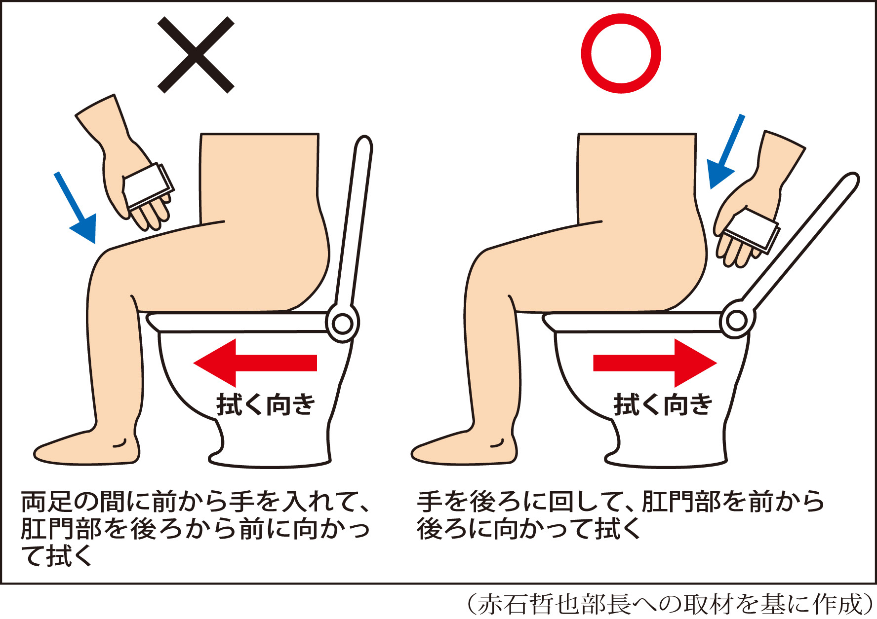 >後ろに手を回して前から後ろに拭くけど後ろから前にも拭くだろ