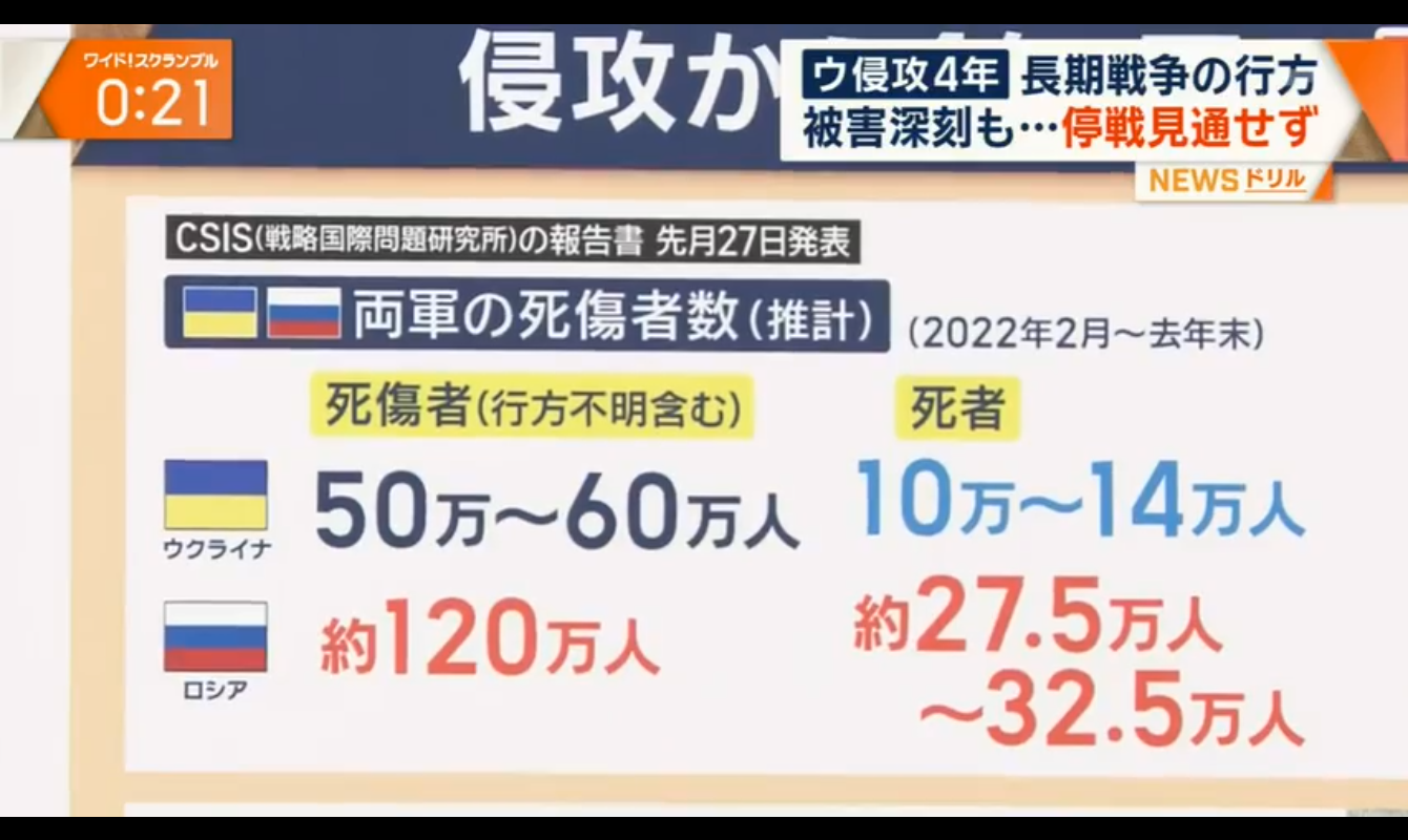 | … | 5226/02/23(月)19:32:28No.1404886523そうだねx6ウクライナ戦争 4年で10万人死亡 |