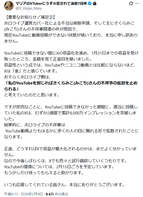 | … | 3126/02/24(火)13:16:49No.1405117429そうだねx15あっちこっちで炎上騒ぎ置きすぎてて最近の企業とかの動向見ると「Xで燃えてるから」なんてのがもう何の判断基準にもなってないんだというのがよくわかるな |