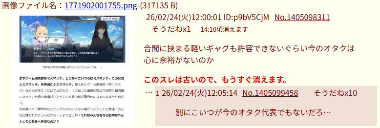| … | 1526/02/24(火)14:29:17No.1405132487そうだねx3ある程度スレ伸びた後でブルアカ粘着するのにもその本文とスレ画向いてないから諦めて自演するかコピペに頼って粘着した方がいいと思う |