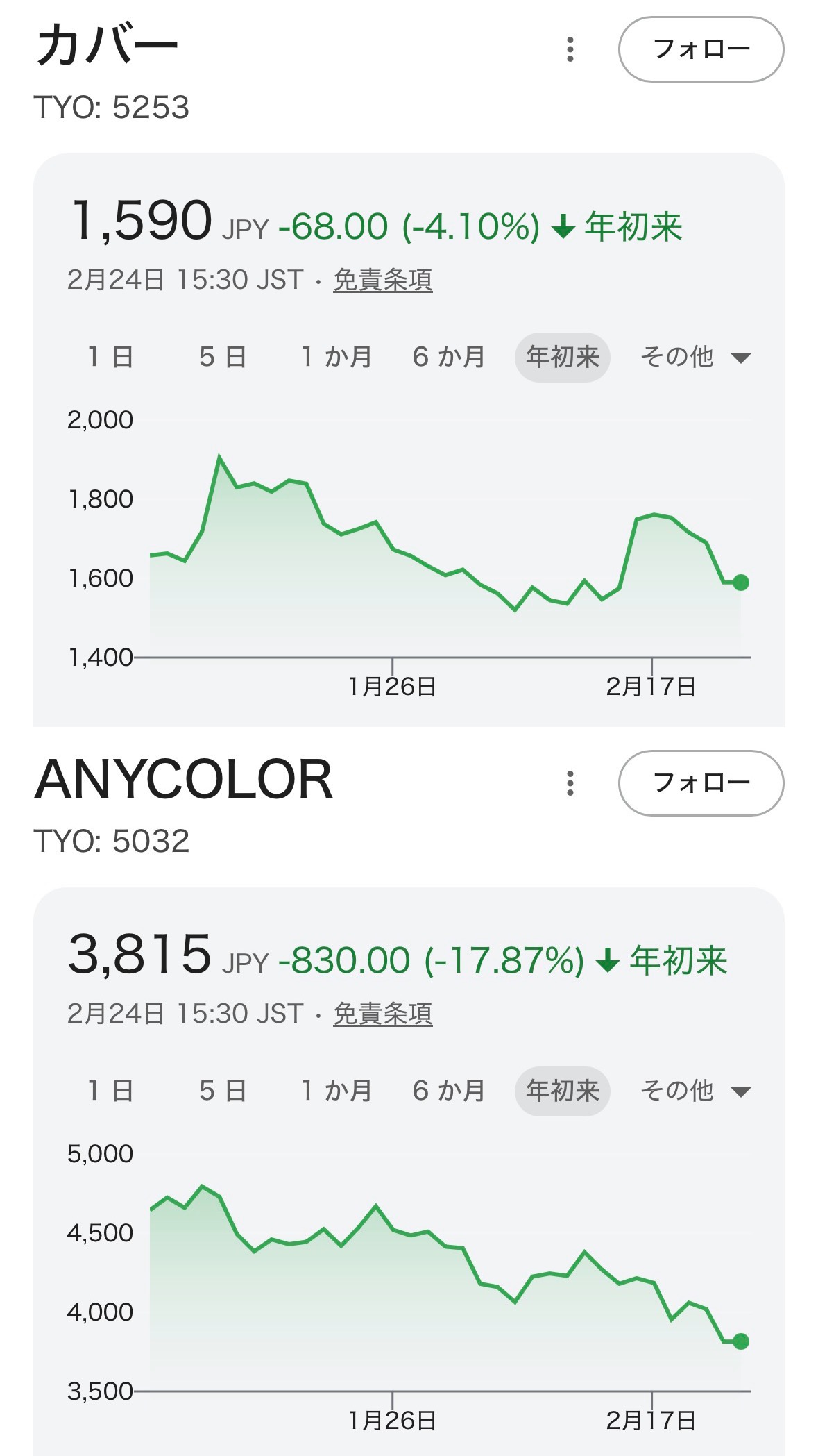 | … | 56526/02/24(火)19:00:31No.1405197334+>>>>どっちもどっちと言うには下落率の差が大きいな |