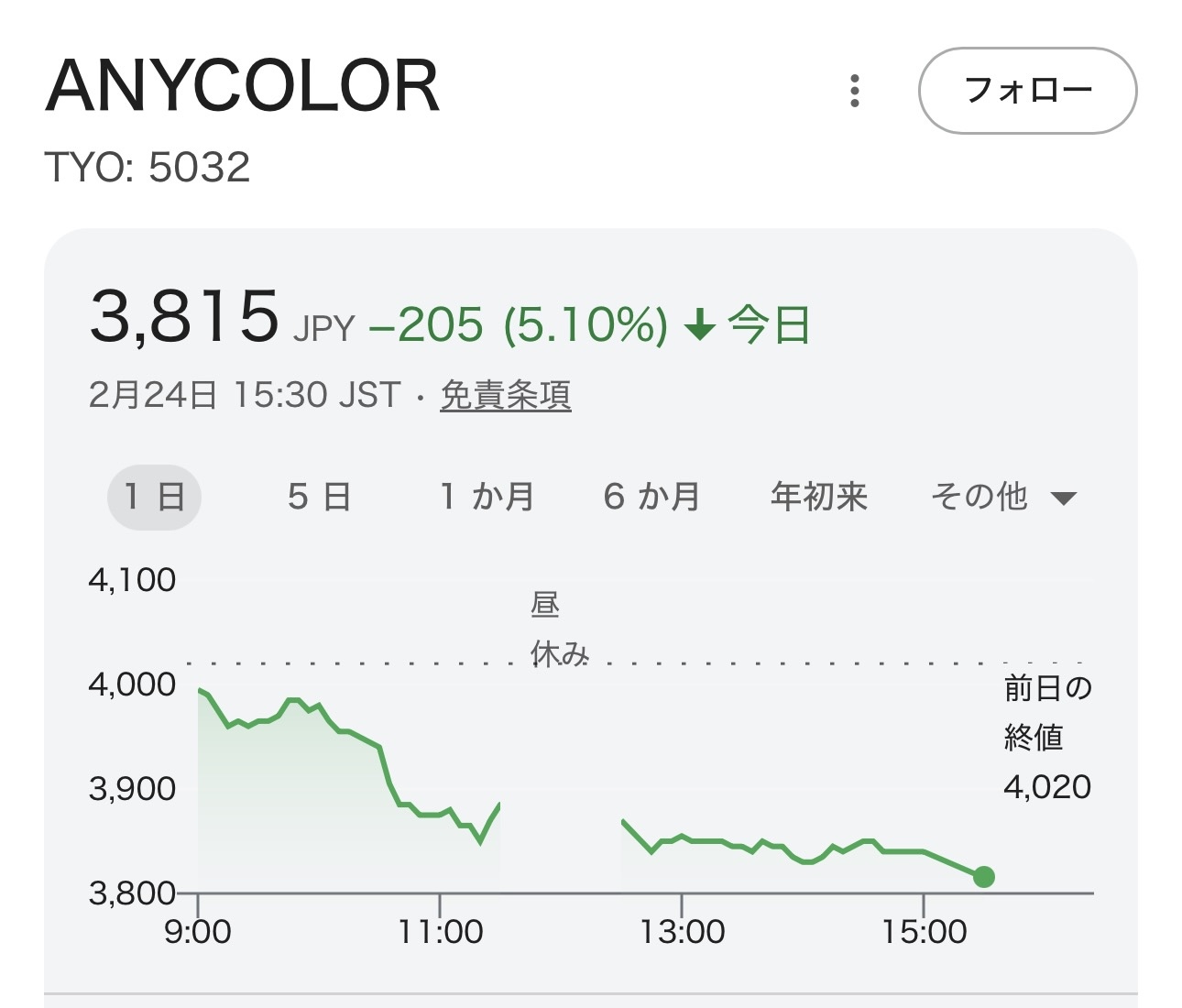 | … | 8426/02/24(火)17:45:58No.1405175714+>>エニーカラーの株価下落を真面目に考察するとやっぱ上り目感じられないのかな |