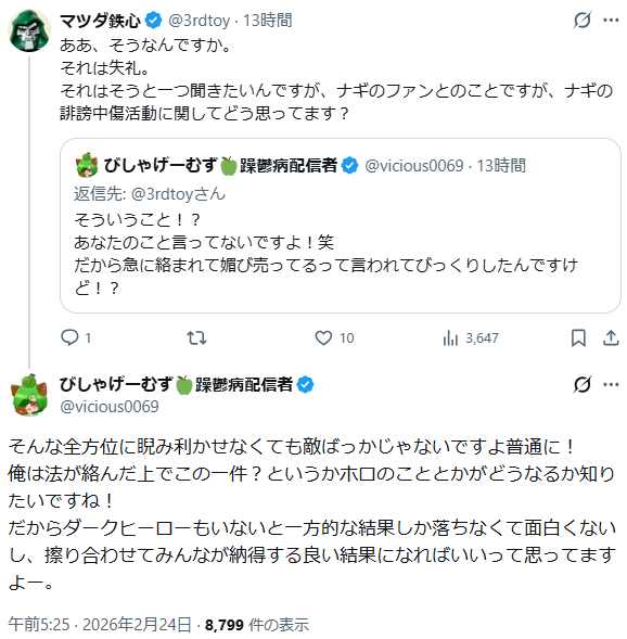 | … | 2026/02/24(火)19:07:53No.1405200036+>>ミネルヴァって自分はぺこら推しのみこアンで〜って言ってコレコレの配信に出てたやつじゃなかった? |