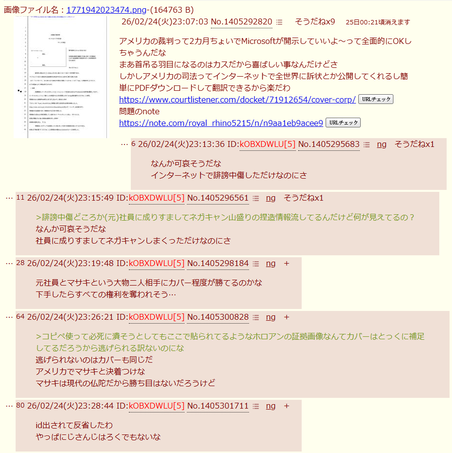 | … | 6026/02/24(火)23:25:32No.1405300506+>違う違う本来は裁判回避できたのに自分から最速対応でカリフォルニアの裁判やるようにカバーを動かしたんだよ |