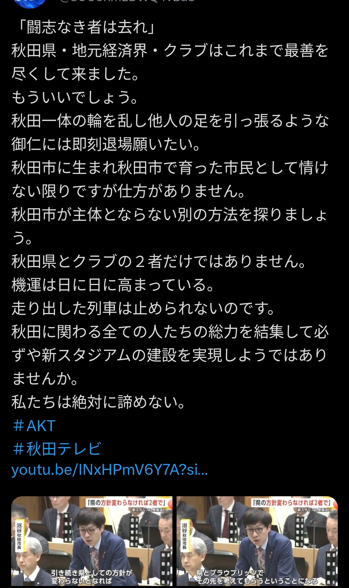 | … | 2826/02/24(火)23:30:02No.1405302184そうだねx8>「引き続き県としての方針が変わらないとなれば、県とブラウブリッツでその先を考えてもらうということになる。その結果、仮にスタジアム整備が難しいということになったとしても、それがイコール秋田県からプロサッカーチームがなくなるということだと直結して捉えていないし、直結すべきことだと思っていない。プロスポーツの存続の責任まで自治体が負うのか、私はそうではないと思っている」 |