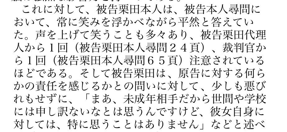 | … | 526/02/25(水)01:14:53No.1405333546+>守山修生裁判長は、原告の性的自己決定権が侵害されたと認めて、男性に1100万円の支払いを命じた。一方、学校法人に対する請求は棄却した。 |