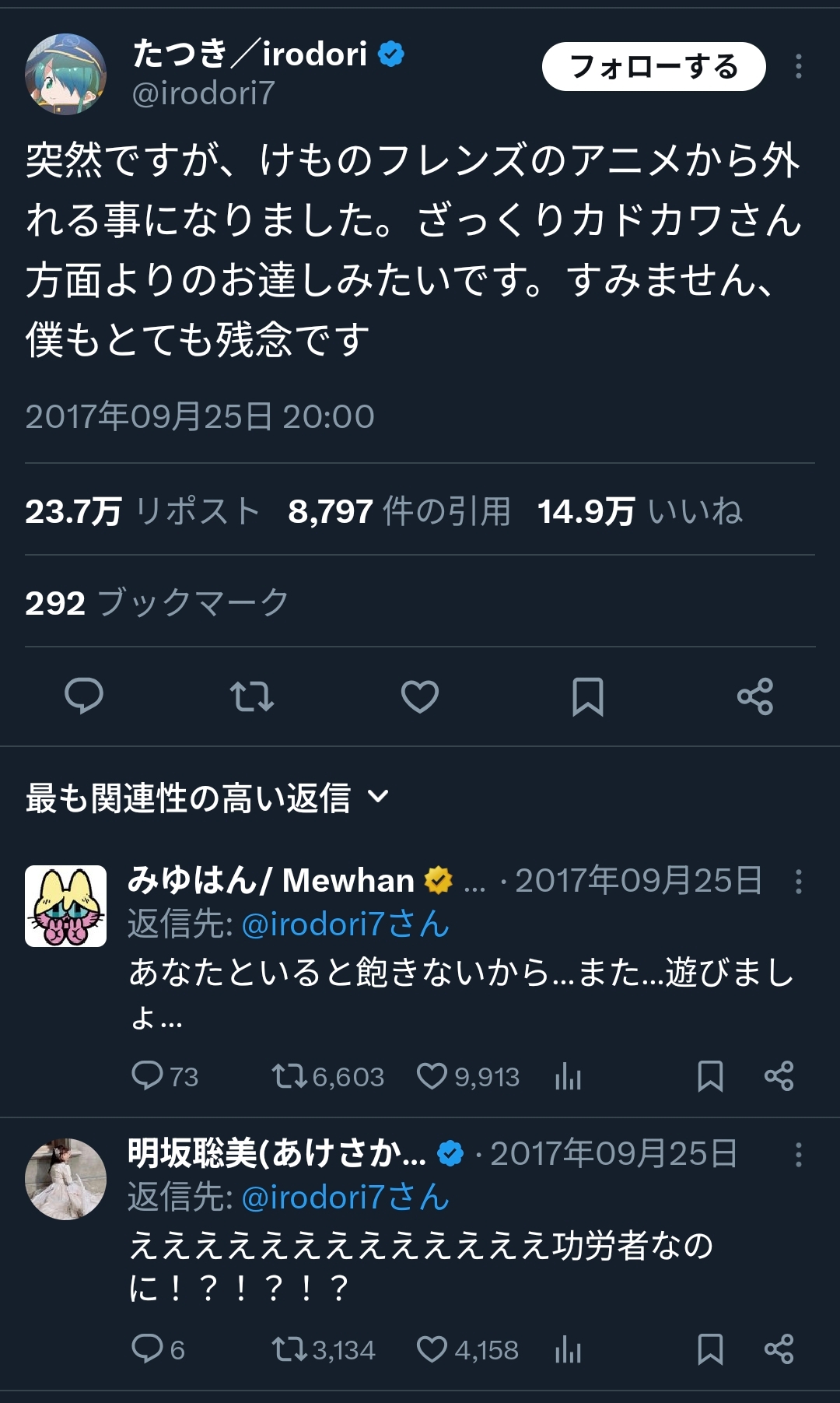 | … | 4326/02/25(水)09:06:30No.1405364602+アニメが始まる前からけもフレを推してた人たちが当時どう感じたかはちょっと気になる |