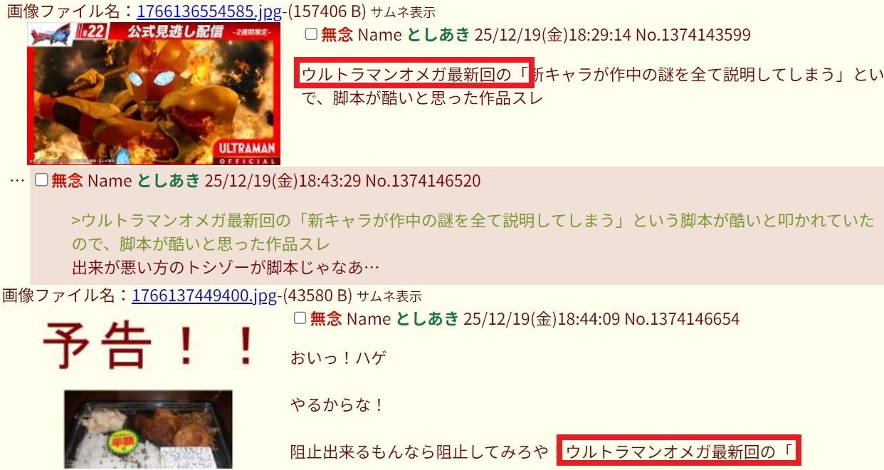 | … | 1526/02/25(水)16:35:45No.1405452317そうだねx6>どんなクソを生み出しても肯定されるウルトラマン |