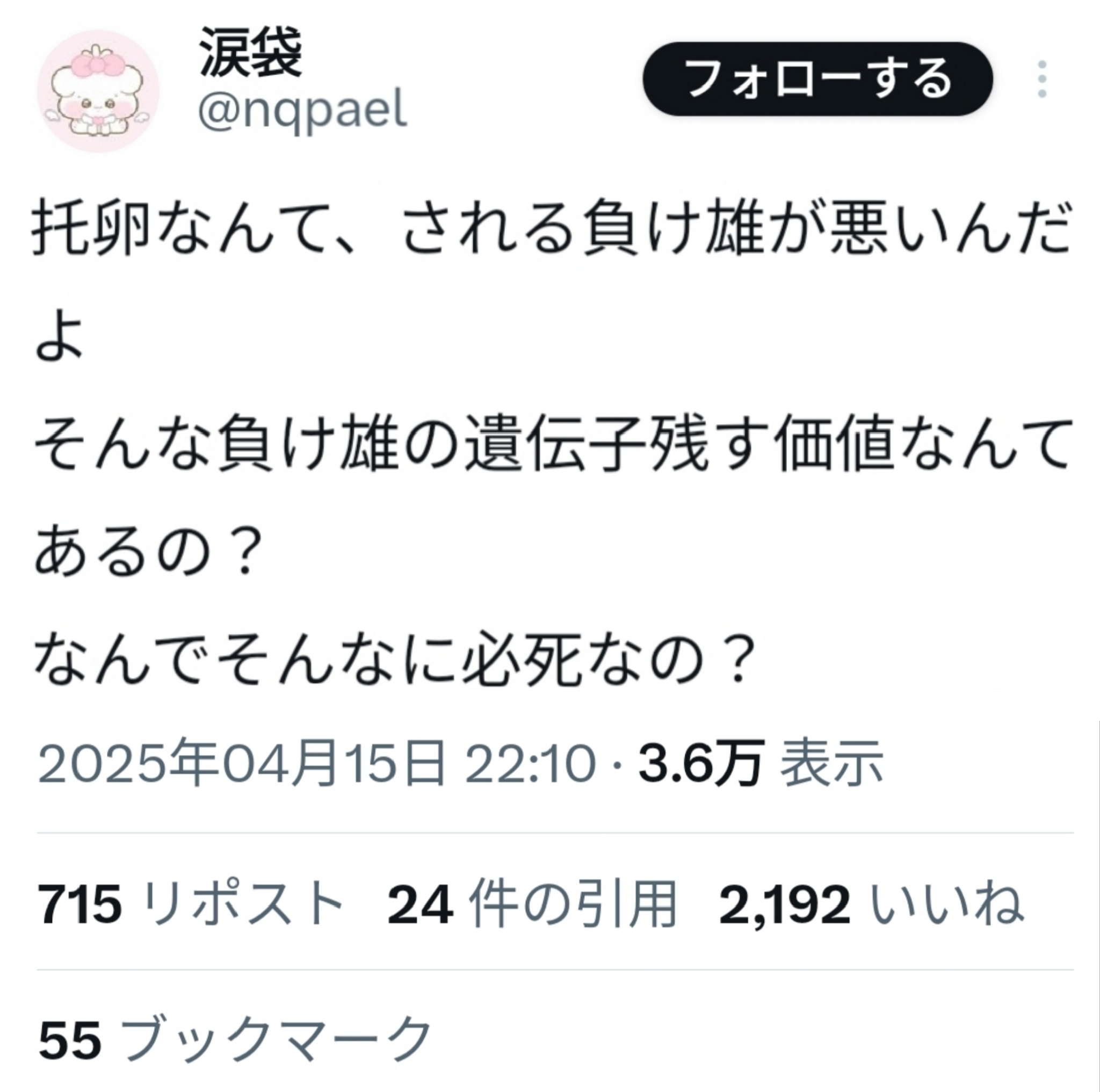 托卵される負けオスが悪いよね...このスレは古いので、もうすぐ消えます。