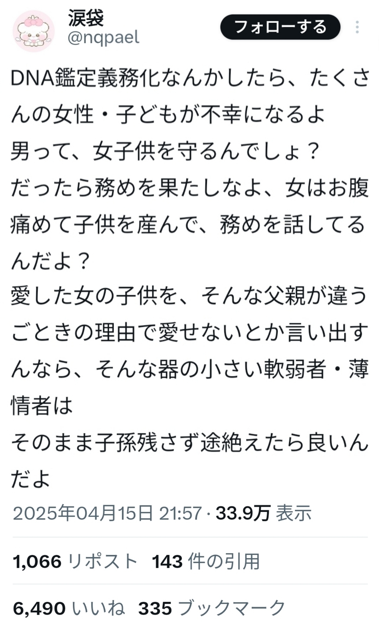 | … | 426/02/25(水)17:24:46No.1405463007+相手が誰だろうと産むの自分だから関係ないよね?って論調で自分の不貞を棚に上げてるの最高に女さんって感じ |