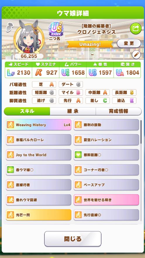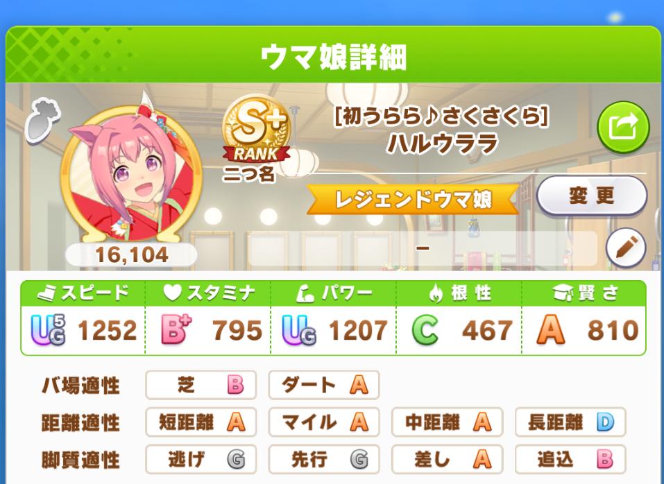 | … | 1526/02/25(水)19:39:29 ID:9uSxp/gsNo.1405504254+二つ名最難関と思われるウララちゃんのレジェンドウマ娘(メイクラシナリオ限定 クラシックまたはティアラ三冠、シニア春三冠、秋三冠)の称号取れました! 魔改造やるならウマプラン手放せないですねこれ fu6342119.jpg |