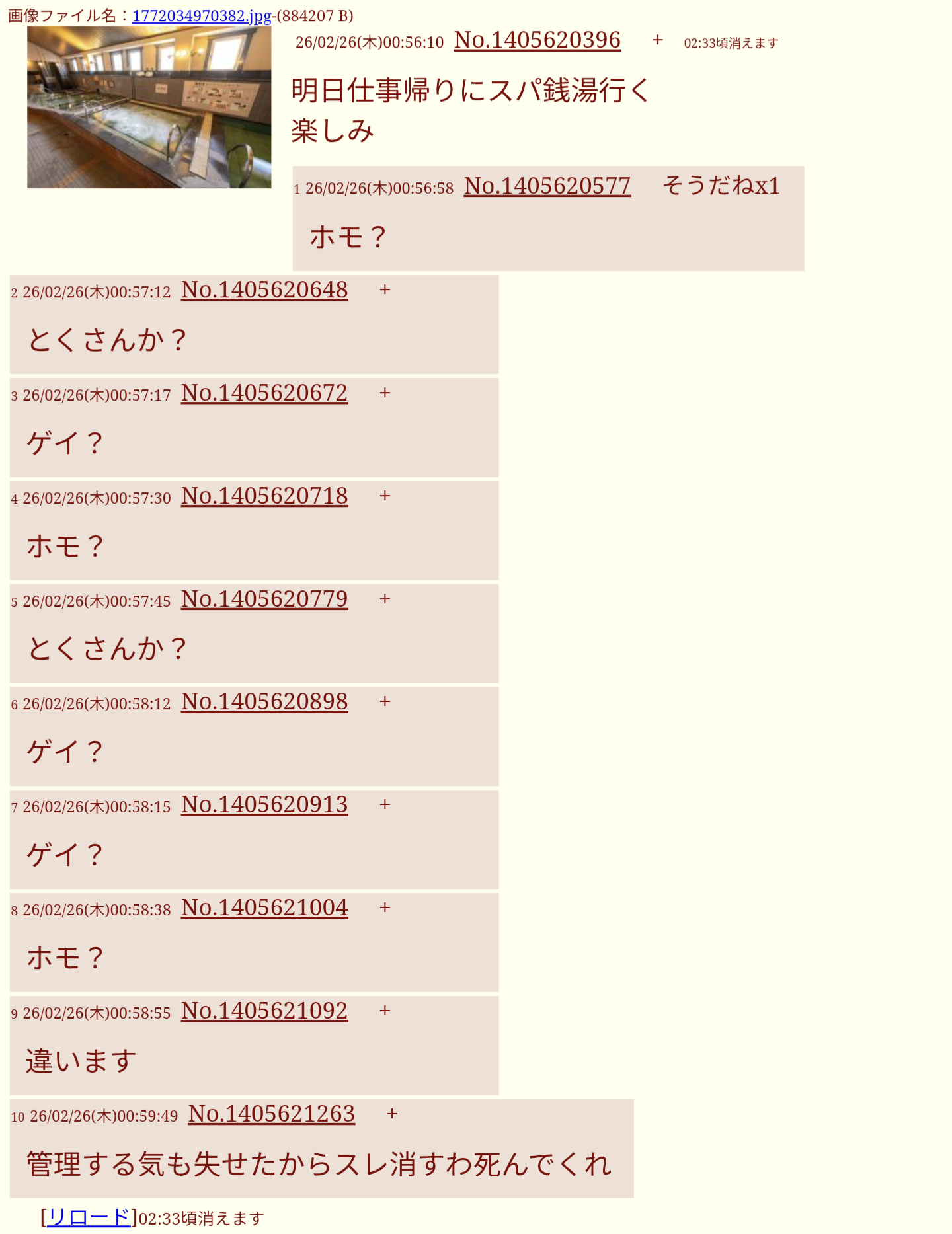 | … | 1026/02/26(木)01:11:15No.1405624047そうだねx3>imgで銭湯に行くなんて言ったらホモ行為以外に目的なんて無いだろ |