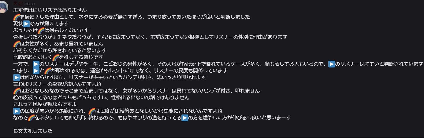 「自分はにじリスじゃないしただのVアンチだけどにじさんじはわるくないのでVアンチのみんなには悪いホロライブだけを攻撃してほしい!」