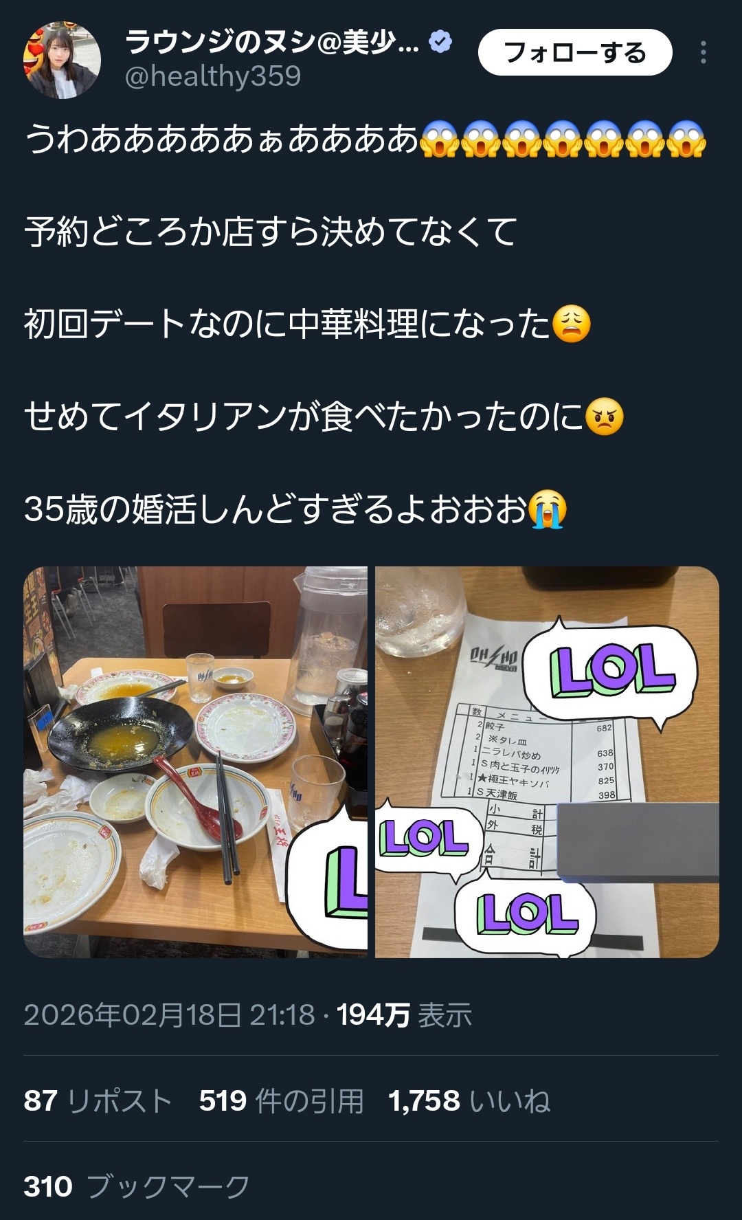 | … | 10626/02/26(木)08:55:25No.1405661856そうだねx1初回デートで王将かあ… |