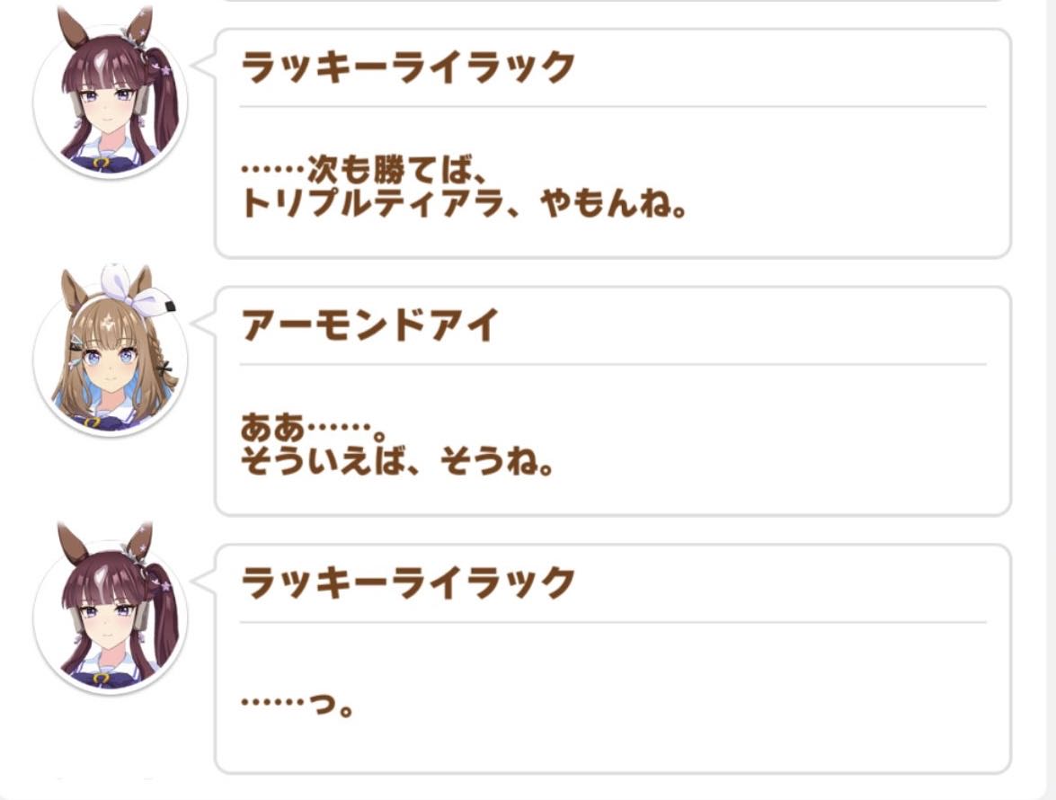 | … | 7926/02/26(木)12:27:52No.1405705794+ララさんが輝いてるせいであたしが闇の三冠ライバル呼ばわりされてるっす |