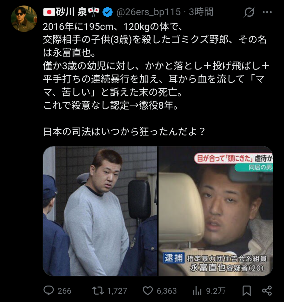 | … | 13026/02/26(木)13:30:57No.1405723529+殺人罪で子供単体だとむしろこれより軽くなる可能性もあるのが不憫 |