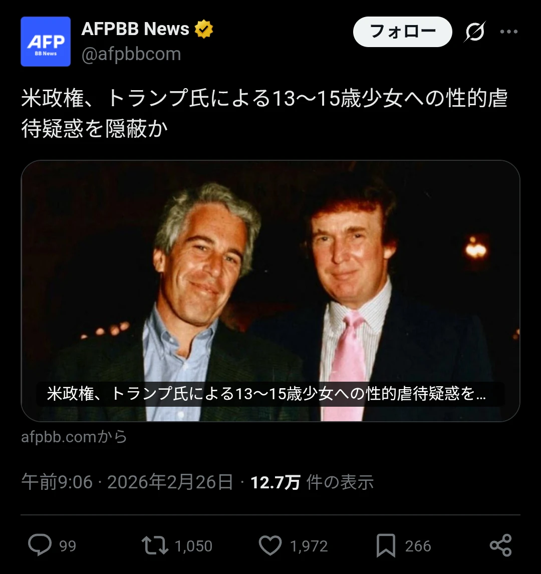| … | 14326/02/26(木)14:51:08No.1405740117そうだねx2エプスタインファイルについては |