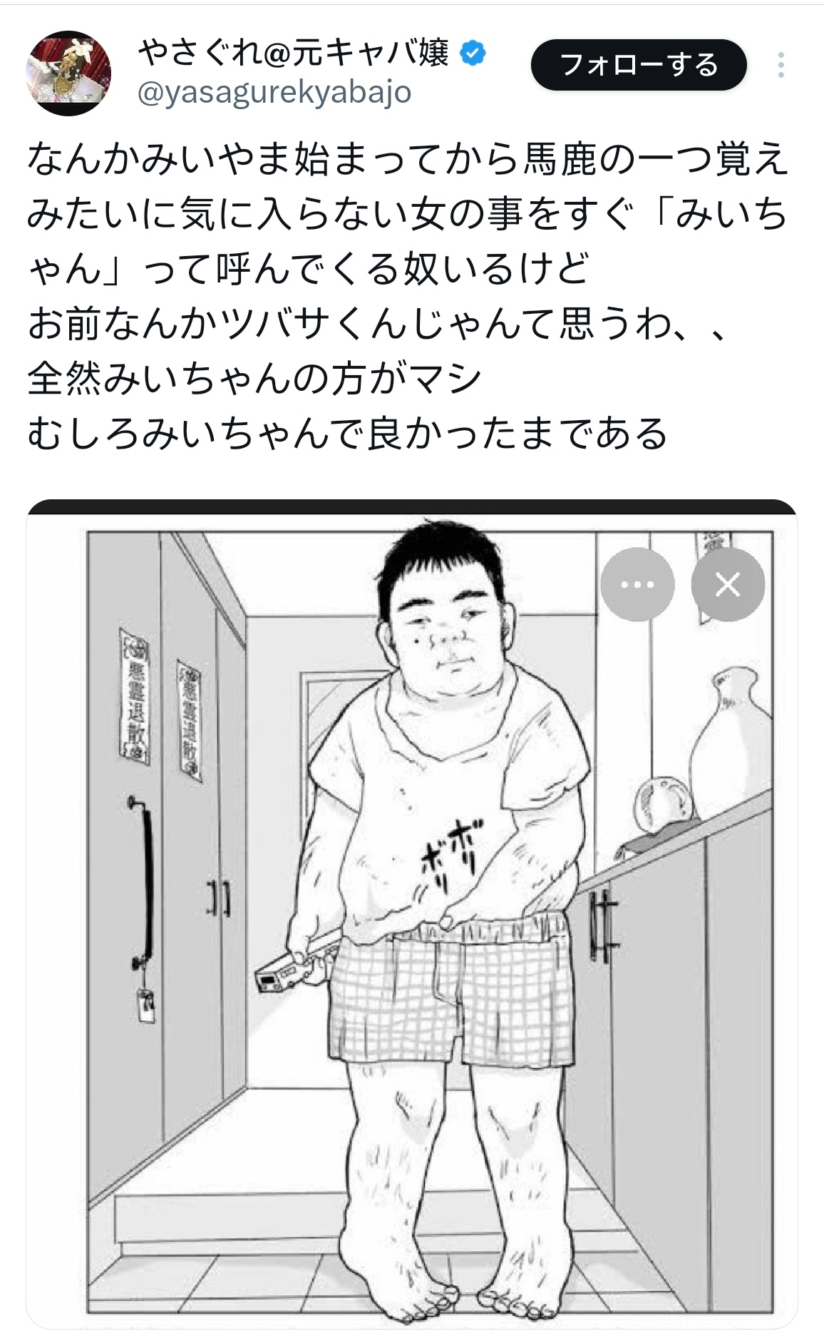 | … | 9426/02/26(木)15:48:16No.1405752026そうだねx5みいちゃんの作者が男ならまだ逃げ道あったんだけど…残念だったな可哀想に |