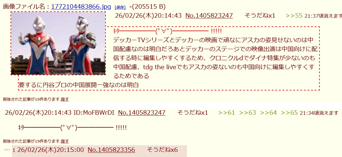 | … | 2626/02/26(木)20:28:22No.1405828443+特撮の粘着荒らしを自身の個性にするなんて悲しすぎるだろ |