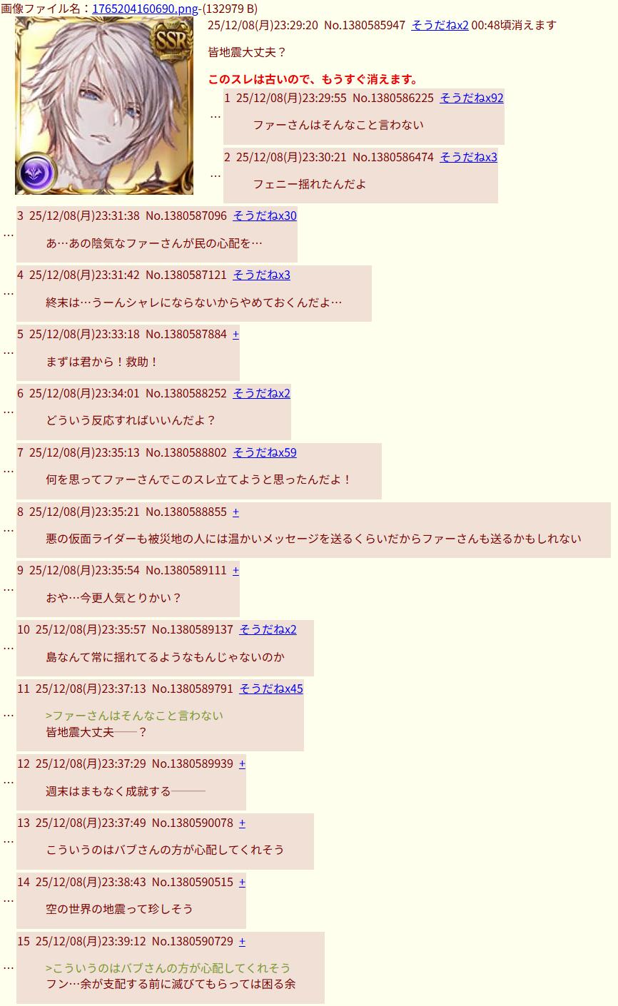 | … | 70026/02/26(木)22:48:07No.1405880692+十二神将演技ネタイベかと思ったけど真面目な話やってたのか… |