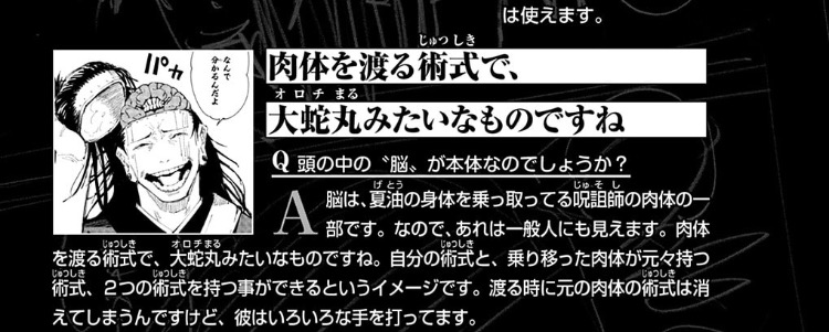 | … | 8026/02/26(木)23:01:45No.1405885627+>本来は夏油の器に入った時にロストするはずだったけど工夫で持ち越してる |