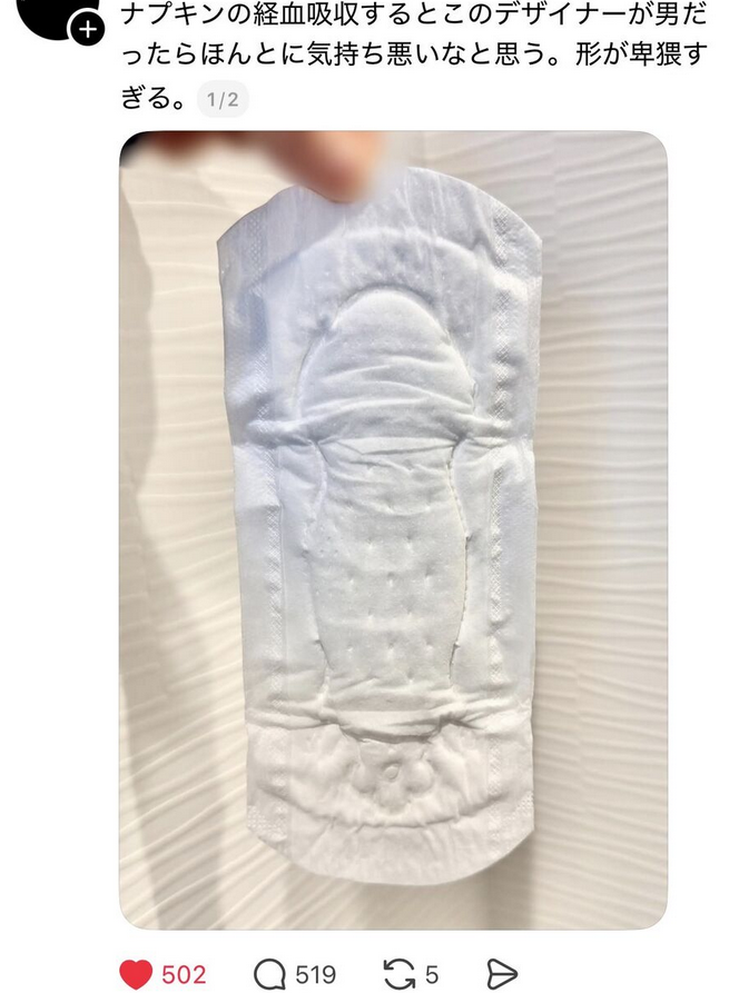 | … | 4326/02/26(木)22:54:48No.1405883181そうだねx8経血吸収部分のデザインが完全にチンポです! |