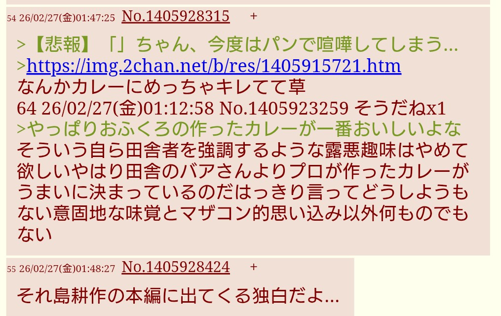 | … | 626/02/27(金)01:26:41No.1405925652+まずいそうだねが取り消された |
