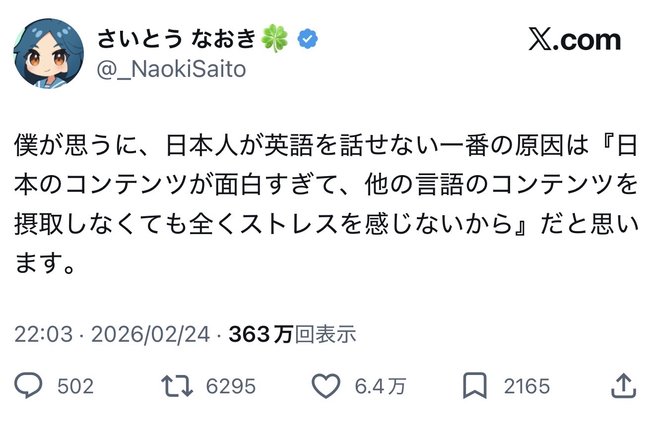 | … | 526/02/27(金)10:17:10No.1405968272そうだねx19生活圏で英語使う必要がほぼないから |